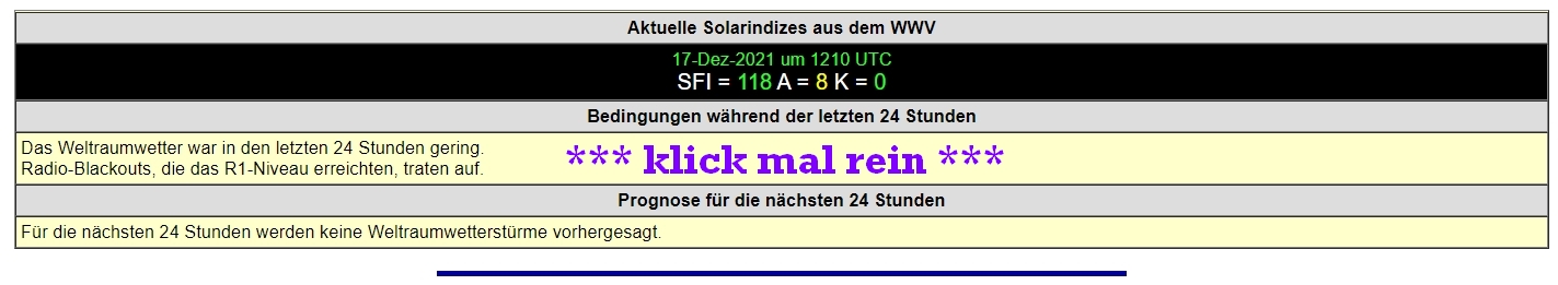 BEISPIEL-Eintrag | Prop Info.WWV: SFI=234 SFI90=187 A=5(Quiet) K=1(Quiet) Aurora=12GW SWX=Minor storm